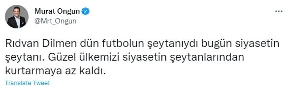 İstanbul Büyükşehir Belediyesi Sözcüsü Murat Ongun sosyal medya hesabından yaptığı tepki çeken paylaşımda 'Rıdvan Dilmen dün futbolun şeytanıydı bugün siyasetin şeytanı. Güzel ülkemizi siyasetin şeytanlarından kurtarmaya az kaldı' dedi.