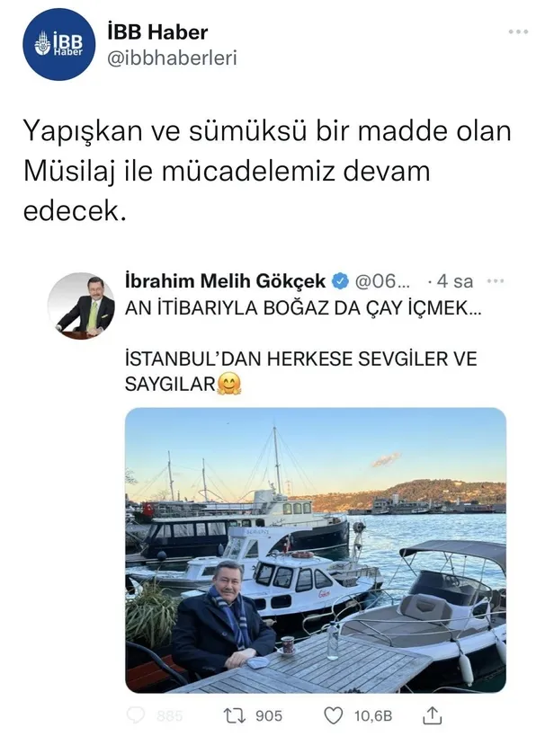 CHP'li İstanbul Büyükşehir Belediyesi'nin haber portalı İBB Haber, sosyal medya hesabından Ankara'nın eski belediye başkanı Melih Gökçek'i hedef seçtiği çirkin bir paylaşıma imza attı. Gökçek'in paylaştığı twetin görüntüsünü alan İBB Haber, 'Yapışkan ve sümüksü bir madde olan Müsilaj ile mücadelemiz devam edecek' notuyla düştü.