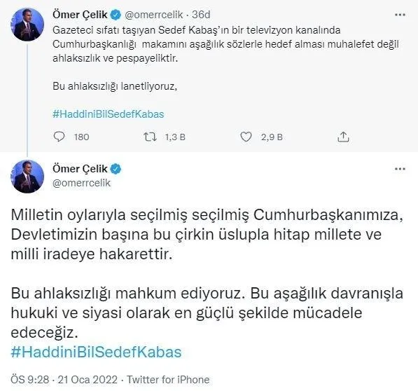 AK Parti Sözcüsü Ömer Çelik, Kabaş'ın ifadelerini ahlaksızlık olarak değerlendirerek, "Gazeteci sıfatı taşıyan Sedef Kabaş'ın bir televizyon kanalında Cumhurbaşkanlığı makamını aşağılık sözlerle hedef alması muhalefet değil ahlaksızlık ve pespayeliktir. Bu ahlaksızlığı lanetliyoruz. Milletin oylarıyla seçilmiş Cumhurbaşkanımıza, devletimizin başına bu çirkin üslupla hitap millete ve milli iradeye hakarettir. Bu ahlaksızlığı mahkum ediyoruz. Bu aşağılık davranışla hukuki ve siyasi olarak en güçlü şekilde mücadele edeceğiz" ifadelerini kullandı.