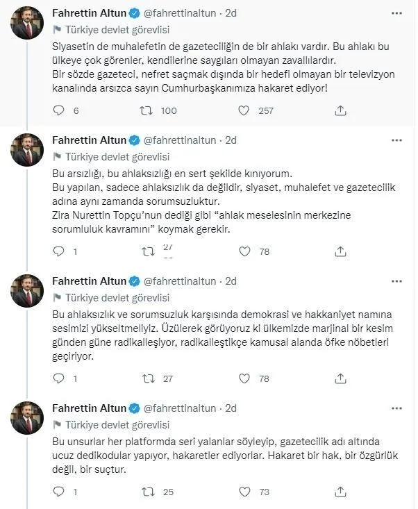 "Siyasetin de muhalefetin de gazeteciliğin de bir ahlakı vardır. Bu ahlakı bu ülkeye çok görenler, kendilerine saygıları olmayan zavallılardır. Bir sözde gazeteci, nefret saçmak dışında bir hedefi olmayan bir televizyon kanalında arsızca sayın Cumhurbaşkanımıza hakaret ediyor!