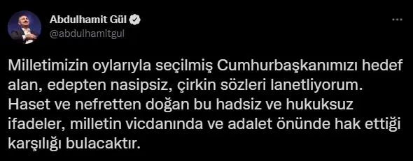 Cumhurbaşkanlığı makamının onuru, milletimizin onurudur. Cumhurbaşkanlığı makamı, bu milletin iradesini temsil eder. Milli iradeye saldırmak ancak hadsizlerin yapacağı bir iştir. Cumhurbaşkanımıza ve makamına yapılan galiz hakaretleri bir kez daha şiddetle kınıyorum."