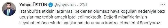 Yahya Üstün sosyal paylaşım sitesi Twitter hebasından yaptığı açıklamada "İstanbul'da etkisini artırması beklenen olumsuz hava koşulları nedeniyle bazı uçuşlarımız tedbir amaçlı iptal edilmektedir. Değerli misafirlerimizin seyahatleri öncesinde uçuşlarının durumunu kontrol etmelerini öneriyoruz" denildi.
