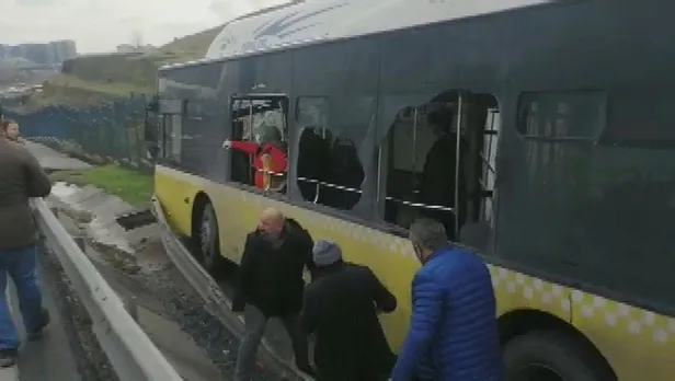 Bariyerleri kırıp aşan otobüs yeşillik alandaki Atatürk Havalimanı'nın demir korkuluklarına yaslandı. Kapıların açılmaması üzerine yolculardan biri çekiçle otobüsün camları kırdı.