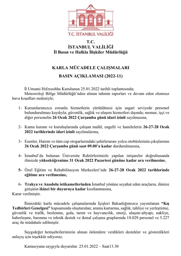İstanbul Valiliği'nden yapılan açıklamada, "İl Umumi Hıfzıssıhha Kurulunun 25.01.2022 tarihli toplantısında; Meteoroloji Bölge Müdürlüğü'nden alınan tahmin raporları ve devam eden olumsuz hava koşulları nedeniyle;