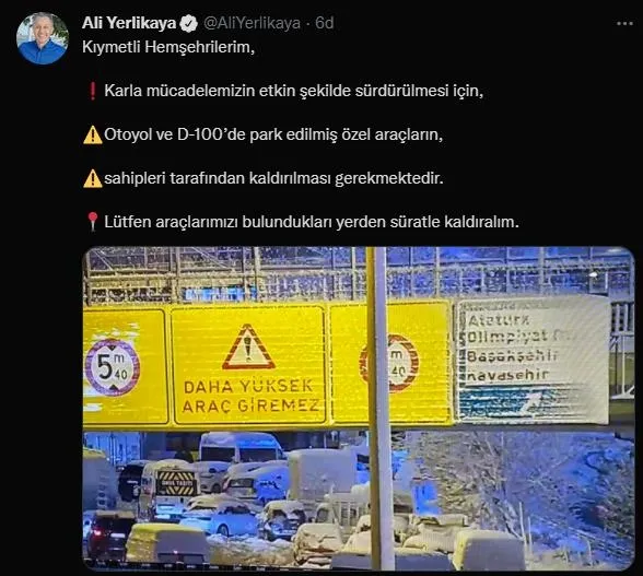 SAAT: 09.10 İstanbul Valisi Ali Yerlikaya, "Karla mücadelemizin etkin şekilde sürdürülmesi için, Otoyol ve D-100'de park edilmiş özel araçların, sahipleri tarafından kaldırılması gerekmektedir. Lütfen araçlarımızı bulundukları yerden süratle kaldıralım." açıklamasında bulundu.