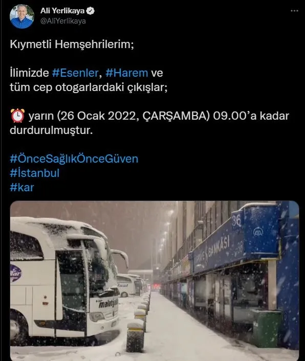 SAAT: 12.46 İstanbul Valisi Ali Yerlikaya, "Kıymetli Hemşehrilerim;İlimizde #Esenler, #Harem ve tüm cep otogarlardaki çıkışlar; yarın (26 Ocak 2022, ÇARŞAMBA) 09.00'a kadar durdurulmuştur." açıklamasında bulundu.