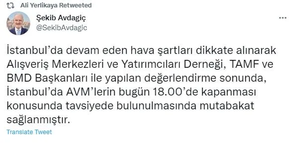 13.53: İstanbul Ticaret Odası Yönetim Kurulu Bşk. Şekib Avdagiç: İstanbul'da devam eden hava şartları dikkate alınarak Alışveriş Merkezleri ve Yatırımcıları Derneği, TAMF ve BMD Başkanları ile yapılan değerlendirme sonunda, İstanbul'da AVM'lerin bugün 18.00'de kapanması konusunda tavsiyede bulunulmasında mutabakat sağlanmıştır.