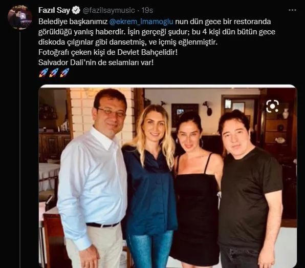 Sosyal medya hesabından açıklama yapan Fazıl Say, ''Belediye başkanımız Ekrem İmamoğlu'nun dün gece bir restoranda görüldüğü yanlış haberdir. İşin gerçeği şudur; bu 4 kişi dün bütün gece diskoda çılgınlar gibi dansetmiş, ve içmiş eğlenmiştir.