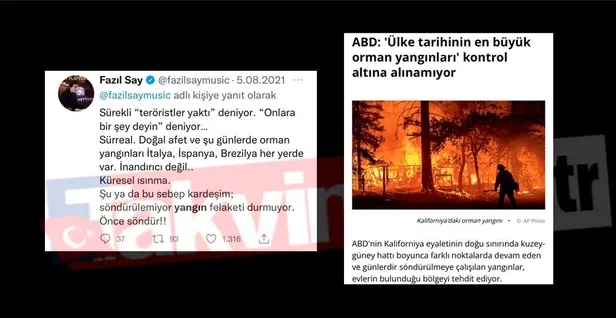 Say'ın bu yaklaşımı sosyal medyada tepki topladı. Sosyal medyada CHP yandaşı piyanisttin o dönem attığı bir tweeti paylaşan bir kullanıcı, "ABD'de orman yangını çıkmış haftalarca devam etmişti. Bizdeki yangında gösterilen gayreti niye görmedin?" diyerek tepki gösterdi.