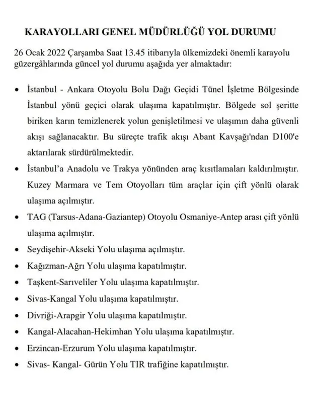 Karayolları Genel Müdürlüğü'nden yapılan açıklamada, saat 13.45 itibarıyla önemli kara yolu güzergahlarında güncel yol durumuna ilişkin bilgi verildi.