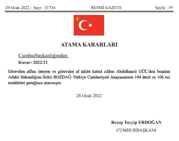Başkan Recep Tayyip Erdoğan'ın imzasıyla Resmi Gazete'de yayımlanan karara göre; Adalet Bakanı Abdulhamit Gül görevden affını istedi. Gül'den boşalan koltuğa TBMM Anayasa Komisyonu Başkanı ve AK Parti Yozgat Milletvekili Bekir Bozdağ atandı. Yeni Adalet Bakanı Bekir Bozdağ, Adalet Bakanlığı'nda düzenlenen törenle görevi Abdulhamit Gül'den devraldı.