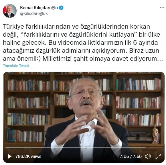 CHP'nin sosyal medya hesaplarından yayınlanan bir video ile iktidara gelmeleri durumunda özgürlükler başlığı altında yapacakları ilk düzenlemeleri sıralayan CHP Lideri Kemal Kılıçdaroğlu, 6. maddesinde sözü 'cinsel yönelim' ifadeleriyle perdeleyerek LGBT'ye getirdi.