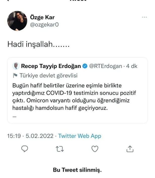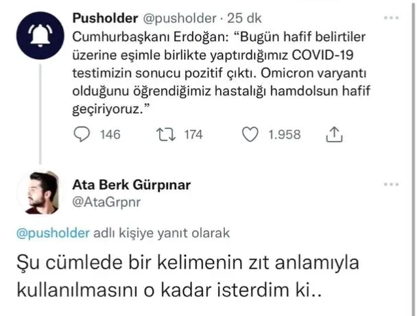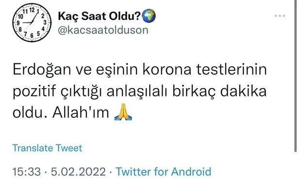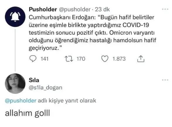Başkan Erdoğan, sosyal medya hesabından yaptığı paylaşımda, "Bugün hafif belirtiler üzerine eşimle birlikte yaptırdığımız COVID-19 testimizin sonucu pozitif çıktı. Omicron varyantı olduğunu öğrendiğimiz hastalığı hamdolsun hafif geçiriyoruz. Görevimizin başındayız. Çalışmalarımıza evde devam edeceğiz. Dualarınızı bekliyoruz." ifadelerini kullandı.