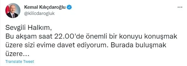 Aydın Doğan'ın sahibi olduğu ve geceliği 100 bin lira olan otelde fakir edebiyatı yaparken İmamoğlu ekibi tarafından görüntüleri sızdırılarak ifşa edilen CHP lideri Kemal Kılıçdaroğlu yine evine dönerek "mütevazı" imajı vermeye devam edecek. Kılıçdaroğlu sosyal medyadan bir paylaşım daha yapacağını belirterek, "Bu akşam saat 22.00'de önemli bir konuyu konuşmak üzere sizi evime davet ediyorum" ifadelerini kullandı.