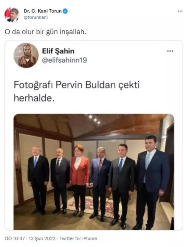 Öte yandan Ahmet Davutoğlu'nun Genel Başkanı olduğu Gelecek Partisi'nin Genel Sekreteri Kani Torun, muhalefet partilerinin genel başkanlarının görüşmesi sonrası paylaşılan fotoğrafa yapılan "Fotoğrafı Pervin Buldan çekti herhalde" yorumuna, "O da olur bir gün inşallah." sözleriyle yanıt verdi.