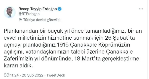 Son dakika haberleri... Başkan Recep Tayyip Erdoğan "Planlanandan bir buçuk yıl önce tamamladığımız, bir an evvel milletimizin hizmetine sunmak için 26 Şubat'ta açmayı planladığımız 1915 Çanakkale Köprümüzün açılışını, vatandaşlarımızın talebi üzerine Çanakkale Zaferi'mizin yıl dönümünde, 18 Mart'ta gerçekleştirme kararı aldık." dedi.
