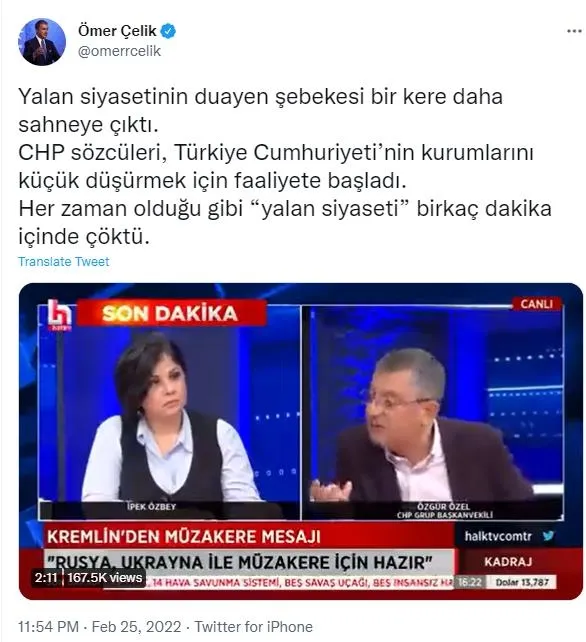 Çelik, Twitter'dan, CHP Grup Başkanvekili Özgür Özel'in bir televizyon programında Ukrayna'daki Türk vatandaşlarının tahliyesi için çalışma gerçekleştirilmediği iddiasına ilişkin yaptığı açıklamada, "Yalan siyasetinin duayen şebekesi bir kere daha sahneye çıktı. CHP sözcüleri, Türkiye Cumhuriyeti'nin kurumlarını küçük düşürmek için faaliyete başladı. Her zaman olduğu gibi 'yalan siyaseti' birkaç dakika içinde çöktü." değerlendirmesinde bulundu.