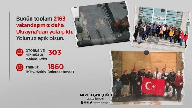 Dışişleri Bakanı Mevlüt Çavuşoğlu, Twitter hesabından yaptığı açıklamada, "Bugün Kiev, Harkiv, Dnipropetrovsk, Odesa ve Lviv'den tren ve otobüslerle 2 bin 163 vatandaşımız daha yola çıktı. Yolunuz açık olsun! Vatandaşlarımızın güvenli tahliyesi için planlamalarımız devam ediyor" dedi.