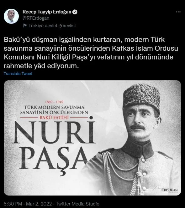 Başkan Recep Tayyip Erdoğan sosyal medya hesabı Twitter üzerinden Kafkas İslam Ordusu Komutanı Nuri Killigil Paşa'yı ölümünün 73'üncü yıl dönümünde andı.