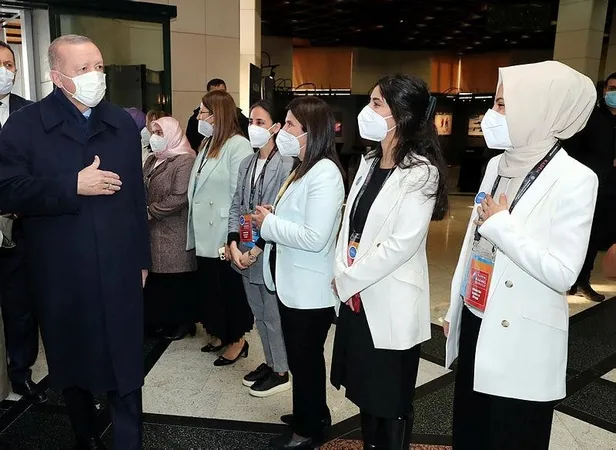 Erdoğan, "Sonuçta kadınların iş gücüne katılımını yüzde 27'ler seviyesinden yüzde 34'ler seviyesine çıkardık. Aynı şekilde kadın istihdamını 6 milyondan 10 milyon sınırına getirdik. Kız çocuklarımızın tamamını eğitimle buluşturarak, her seviyede onların eğitim öğretimlerini destekleyip, kolaylaştırarak artık bu başlığı sorunlarımız arasından neredeyse tamamen çıkardık. Karar mercilerinde kadınlarımızın varlığında gözle görülür bir artış yaşanmasını temin ettik. Mesela, kadınların parlamentodaki temsil oranı yüzde 4 iken yüzde 17'lerin üzerine yükseldi. Üniversitelerimizdeki öğretim elemanları arasında kadınların oranı yüzde 51'e yaklaştı" ifadelerini kullandı.