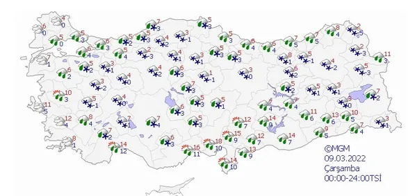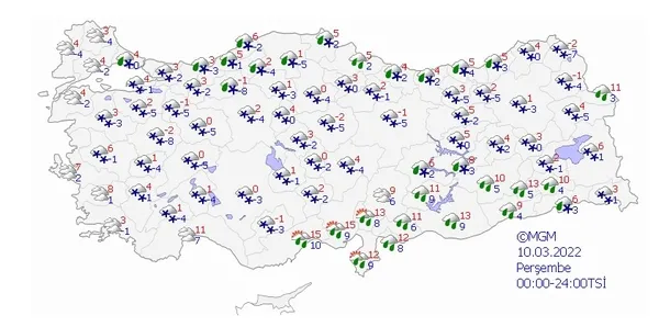 Meteoroloji Genel Müdürlüğü tarafından yapılan son değerlendirmelere göre; Marmara, Ege(Afyonkarahisar hariç), Akdeniz, İç Anadolu'nun güneyi, Doğu Anadolu'nun güneyi, Güneydoğu Anadolu, Doğu Anadolu'nun kuzeydoğusu, Doğu Karadeniz'in doğusu ile Ankara, Eskişehir ve Düzce çevrelerinin yağışlı geçeceği tahmin ediliyor. Genellikle yağmur ve sağanak, Doğu Akdeniz'in Toroslar kesimi, Doğu Anadolu'nun kuzeydoğusu ile Hakkari ve Bitlis çevrelerinin karla karışık yağmur ve kar şeklinde olması beklenen yağışların; Kıyı Ege ile Edirne Manisa çevrelerinde yerel olarak kuvvetli olması bekleniyor. Sabah ve gece saatlerinde iç ve doğu kesimlerde buzlanma ve don olayı bekleniyor.