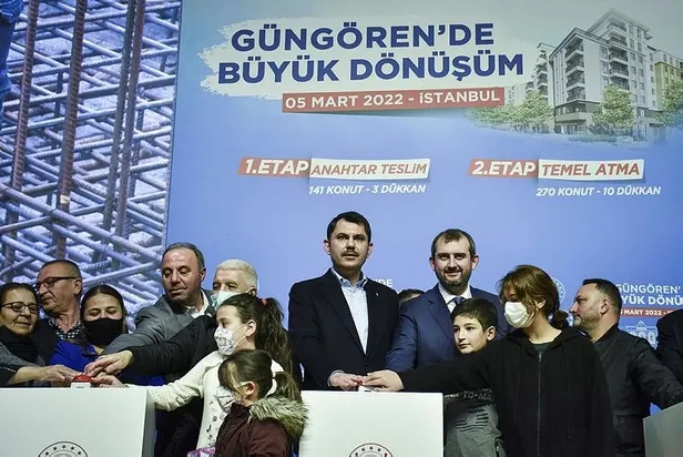 Törende konuşmaların ardından hak sahibi ailelere Bakan Kurum, Emlak Konut Genel Müdürü Hakan Gedikli, Güngören Belediye Başkanı Bünyamin Demir'in de aralarında bulunduğu katılımcılar tarafından anahtar ve tapuları verildi.