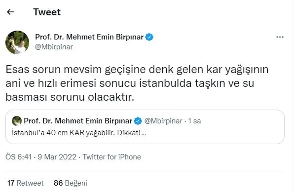 Çevre, Şehircilik ve İklim Değişikliği Bakan Yardımcısı Prof.Dr. Mehmet Emin Birpınar sosyal medya hesabından yaptığı paylaşımda "İstanbul'a 40 cm KAR yağabilir. Dikkat!…" ifadelerini kullandı.