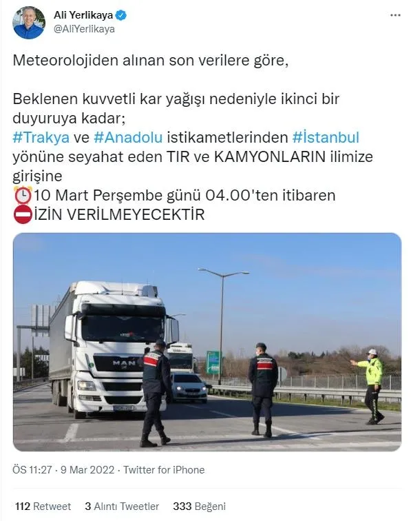 Vali Yerlikaya Twitter hesabından yaptığı açıklamada, " Meteorolojiden alınan son verilere göre, beklenen kuvvetli kar yağışı nedeniyle ikinci bir duyuruya kadar; Trakya ve Anadolu istikametlerinden İstanbul yönüne seyahat eden TIR ve kamyonların ilimize girişine 10 Mart Perşembe günü 04.00'ten itibaren izin verilmeyecektir."