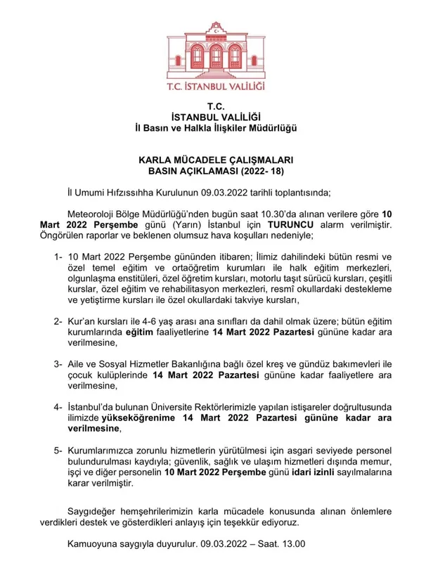 İstanbul'da beklenen yoğun kar yağışı nedeniyle dün alınan tedbirleri açıklayan İstanbul Valiliği yeni tedbirleri duyurdu. Alınan kararlara göre tüm özel ve resmi eğitim ve öğretim kurumlarının 14 Mart tarihine kadar tatil edildiği belirtildi. Motokuryelerin, motor ve scooterların ise Çarşamba gece yarısından bir sonraki duyuruya kadar trafiğe çıkışı yasaklandı.
