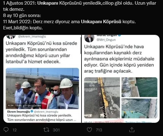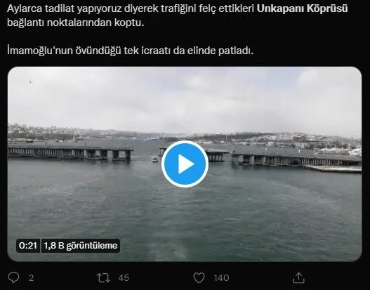İmamoğlu'nu eleştiren vatandaşlar, "Aylarca tadilat yapıyoruz diyerek trafiğini felç ettikleri Unkapanı Köprüsü bağlantı noktalarından koptu. İmamoğlu'nun övündüğü tek icraatı da elinde patladı." diyerek CHP'li Başkanı topa tuttu.
