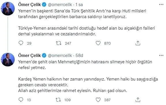 AK Parti Genel Başkan Yardımcısı ve Parti Sözcüsü Ömer Çelik, sosyal medya hesabı Twitter üzerinden Yemen'deki Türk Şehitlik Anıtı'na yapılan saldırıya ilişkin açıklama yaptı. Çelik yaptığı açıklamada Husi unsurlarınca yapılan saldırıyı lanetledi.