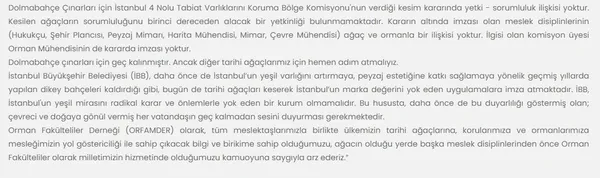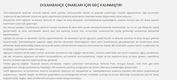 "Dolmabahçe'de yaşanan ağaç ölümleri ekosistem bütünlüğünün adım adım bozulmasıyla gerçekleşmiştir. Bu bozulmanın erken dönemde tespit edilemediği, tespiti sonrasında tedavi yöntemlerinde başarısız olunmasına ek olarak, İBB tarafından yapılan bakım budamaları da hastalığın yayılmasına neden olmuştur.
