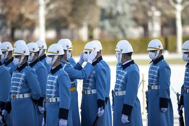 Erdoğan ve Scholz'un tören alanındaki yerlerini almalarının ardından, 21 pare top atışı eşliğinde İstiklal Marşı ile Almanya Milli Marşı çalındı. Scholz, Muhafız Alayı Tören Kıtası'nı selamladı.