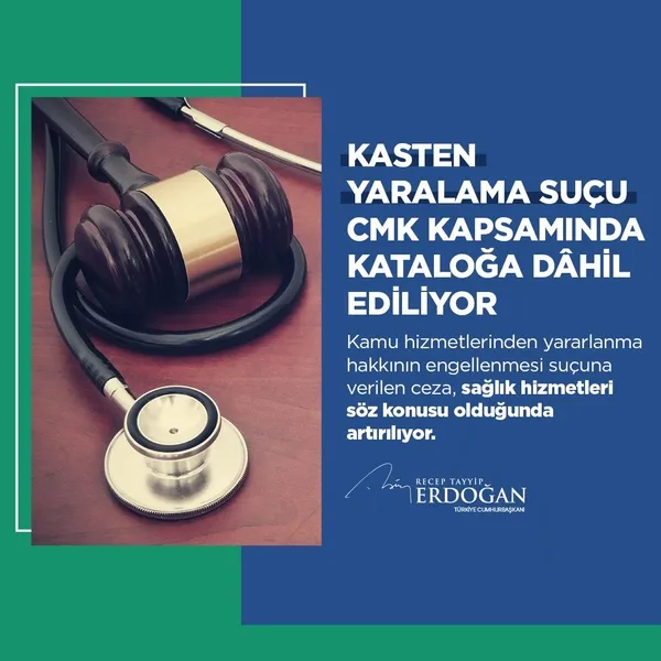 İlk müjdemiz sağlık çalışanlarına yapılan saldırılarla ilgili sıkıntıları kati olarak çözecek bir düzenleme ile ilgilidir. Sağlık kurum ve kuruluşlarında görev yapan personele karşı görevleri sırasında veya görevleri dolayısıyla işlenen kasten yaralama suçu CMK kapsamında katolağa dahil ediliyor.