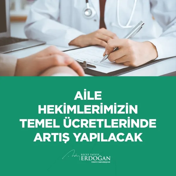 Beşinci müjdemiz de aile hekimlerimizdir. Aile hekimlerimizin temel ücetlerinde artış yapılacaktır. Bu düzenlemelerimizin hekimlerimiz ile tüm sağlık çalışanlarımıza hayırlı olmasını diliyorum.