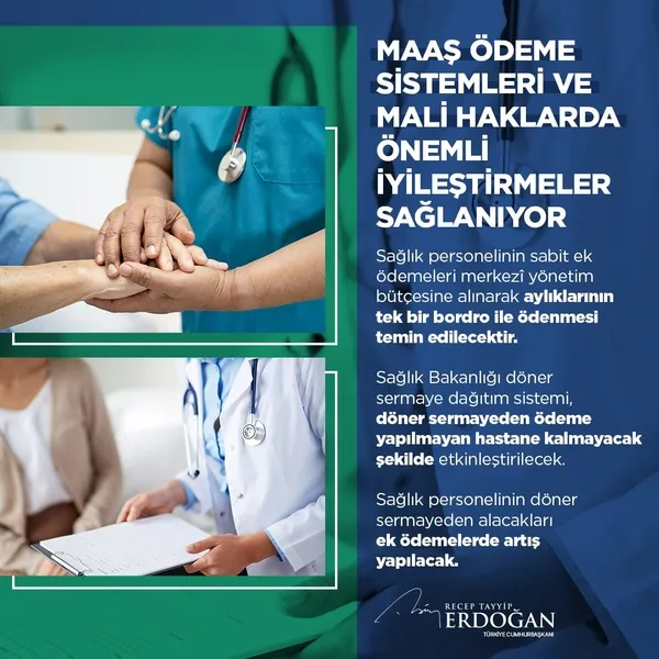 Üçüncü müjdemiz sağlık çalışanlarımızın ücret düzenlemesiyle ilgilidir. Sağlık çalışanlarımızın maaş ödeme sistemlerinde ve mali haklarında önemli iyileştirmeler sağlıyoruz.