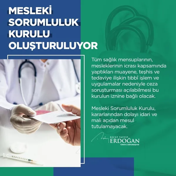 İkinci müjde olarak sağlık çalışanları ilgili bir mesleki sorumluluk kurulu oluşturuyoruz. Tüm sağlık mensuplarının mesleklerinin icrası kapsamında yaptıkları muayene, teşhis ve tedaviye ilişkin tıbbi işlem ve uygulamalar nedeniyle ceza soruşturması açılabilmesi bu kurulun iznine bağlı olacaktır.
