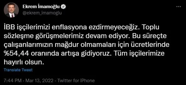 'İmamoğlu, Twitter hesabından yaptığı açıklamada, "İBB işçilerimizi enflasyona ezdirmeyeceğiz. Toplu sözleşme görüşmelerimiz devam ediyor. Bu süreçte çalışanlarımızın mağdur olmamaları için ücretlerinde %54,44 oranında artışa gidiyoruz. Tüm işçilerimize hayırlı olsun" ifadelerini kullanmıştı.