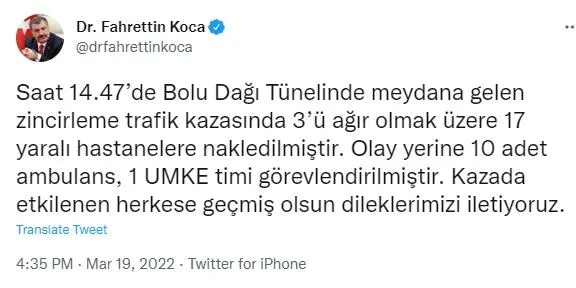 Sağlık Bakanı Fahrettin Koca ise kazaya ilişkin "Saat 14.47'de Bolu Dağı Tünelinde meydana gelen zincirleme trafik kazasında 3'ü ağır olmak üzere 17 yaralı hastanelere nakledilmiştir. Olay yerine 10 adet ambulans, 1 UMKE timi görevlendirilmiştir. Kazada etkilenen herkese geçmiş olsun dileklerimizi iletiyoruz." açıklamasında bulundu.