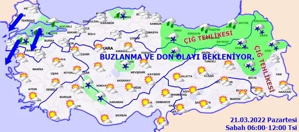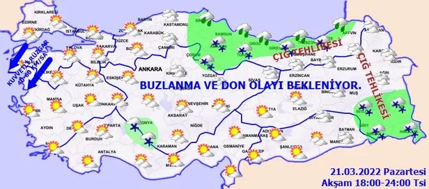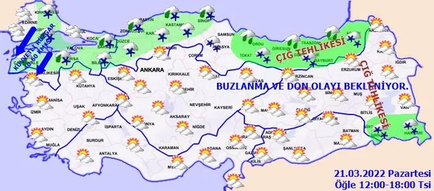 BUZLANMA VE DON OLAYI UYARISI: Sabah ve gece saatlerinde kuzey, iç ve doğu kesimlerde buzlanma ve don olayı beklendiğinden yaşanabilecek olumsuz şartlara karşı dikkatli ve tedbirli olunması gerekmektedir.