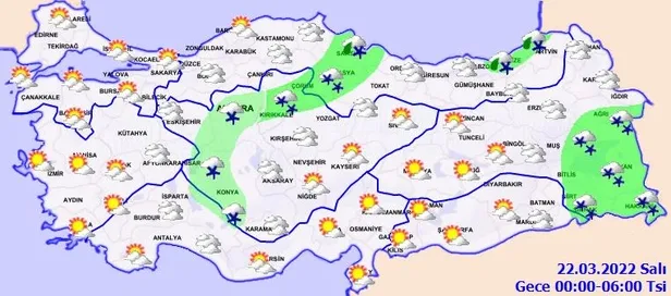 Meteoroloji Genel Müdürlüğü tarafından yapılan son değerlendirmelere göre: Ülkemiz genelinin parçalı ve yer yer çok bulutlu, Marmara (Edirne hariç), Batı Karadeniz, Orta ve doğu Karadeniz'in iç kesimleri, Doğu Anadolu'nun doğusu ile Konya, Ankara, Kırşehir, Sivas, Çankırı ve Kırıkkale çevrelerinin karla karışık yağmur ve kar yağışlı, Orta ve Doğu Karadeniz kıyıları ile İstanbul çevrelerinin yağmurlu geçeceği tahmin ediliyor.