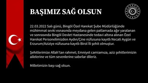 Fakat doktorların tüm çabalarına rağmen 2 polis, kurtarılamayarak şehit oldu. Bingöl Valiliği'nden yapılan açıklamada, Özel Harekat Şube Müdürlüğü'nde mühimmat sevki esnasında meydana gelen patlamada, ağır yaralanan ve Bingöl Devlet Hastanesi'nde tedavi altına alınan Özel Harekat personeli Aydın/Çine nüfusuna kayıtlı Necati Aygün ve Erzurum/Aziziye nüfusuna kayıtlı Birol İli'nin şehit olduğunu duyurdu.