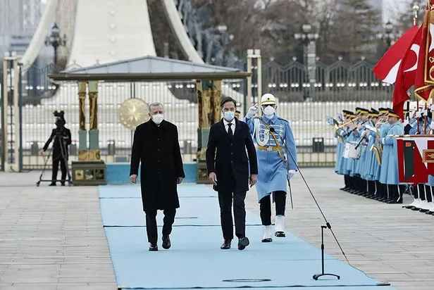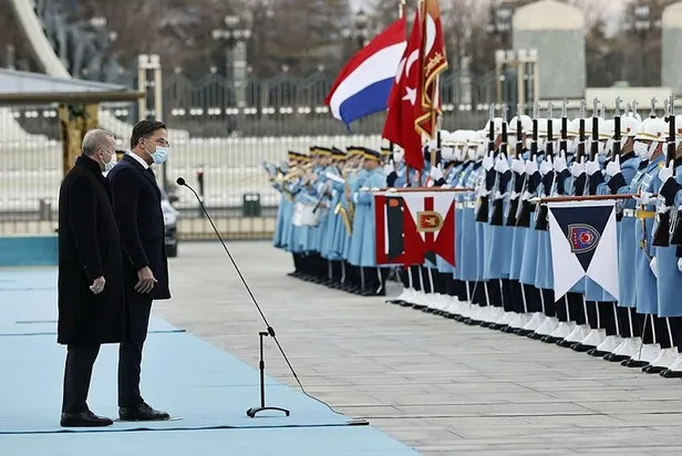 Erdoğan ve Rutte'nin tören alanındaki yerlerini almalarının ardından, 21 pare top atışı eşliğinde İstiklal Marşı ile Hollanda Milli Marşı çalındı. Rutte, Muhafız Alayı Tören Kıtası'nı selamladı.