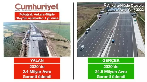 Cumhuriyet Gazetesi Yap-İşlet-Devret (YİD) modeliyle yapılan Ankara-Niğde Otoyolu ile ilgili yaptığı haberde 2020 yılı için ödenen garanti miktarına ilişkin astronomik bir rakam yer aldı. Görsel olarak da otoyolun daha açılmadan önceki fotoğrafını kullanması dikkat çekti.