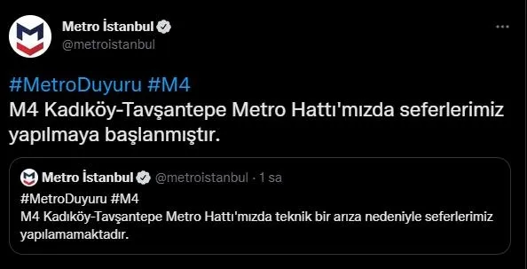 Açıklamada, "M4 Kadıköy-Tavşantepe Metro Hattı'mızda teknik bir arıza nedeniyle seferlerimiz yapılamamaktadır" denildi.