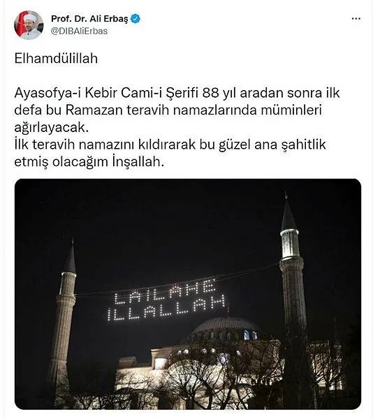 Diyanet İşleri Başkanı Ali Erbaş, Ayasofya-i Kebir Cami-i Şerifi'nde 88 yıl aradan sonra ilk teravih namazını kıldırdı.