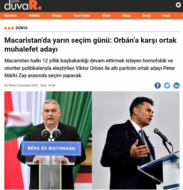 Macaristan'da yapılan genel seçimi halihazırda hükümette yer alan Fidesz (Macar Yurttaş Birliği) ve Hristiyan Demokratik Halk Partisi (KDNP) koalisyonu kazandı. Batı ve Soros destekli 6’lı sol blok seçimde büyük bir hezimete uğradı. Zafer kazanan Viktor Orban, “Macar solu, Soros’un gelmiş geçmiş en kötü yatırımı oldu” dedi. Seçim süreci boyunca Orban için "otoriter", "diktatör" gibi manşetler atan, ülkemizdeki Batı destekli 6'lı ittifaka bel bağlayan, Macaristan'dan 6'lı ittifakın zaferle çıkacağı ümidiyle seçimlerden sonra “Macaristan tamam, sıra Türkiye’de” manşetleri atmaya hazırlanan CHP yandaşı medya ve ittifak üyeleri hüsrana uğradı.