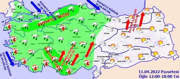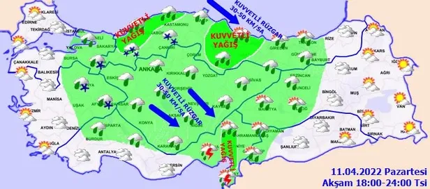 Meteoroloji Genel Müdürlüğünden hava durumuyla ilgili son dakika uyarıları gelmeye devam ediyor. Yapılan son değerlendirmelere göre, yurt genelinin parçalı, yer yer çok bulutlu, Marmara, Ege, Akdeniz, İç Anadolu, Karadeniz, Doğu Anadolu'nun batısı ile Erzurum, Muş, Kilis, Gaziantep, Adıyaman ve Diyarbakır çevrelerinin yağışlı geçeceği tahmin ediliyor. Kuzeybatı kesimlerden başlayarak hava sıcaklıklarının 10-15 derece azalacağı bildirildi. İstanbul'un Avrupa yakası akşam saatlerine, Anadolu yakası gece saatlerine kadar sağanak ve yer yer gök gürültülü sağanak yağışlı geçeceği tahmin ediliyor. 10 il için sarı kodlu uyarı yapıldı. İşte 11 Nisan hava durumu raporu.