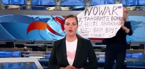 Rusya'da yayın yapan "Perviy Kanal"da canlı yayını sırasında "savaşa hayır" yazılı pankart açan editör Marina Ovsyannikova sosyal medya hesabı üzerinden yatığı açıklamada, Ukrayna'da yaşananların bir suç olduğunu ve Rusya'nın saldırgan bir ülke olduğunu ifade etmesinin ardından Rus polisi tarafından gözaltına alındı.