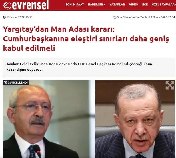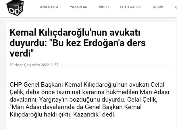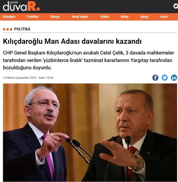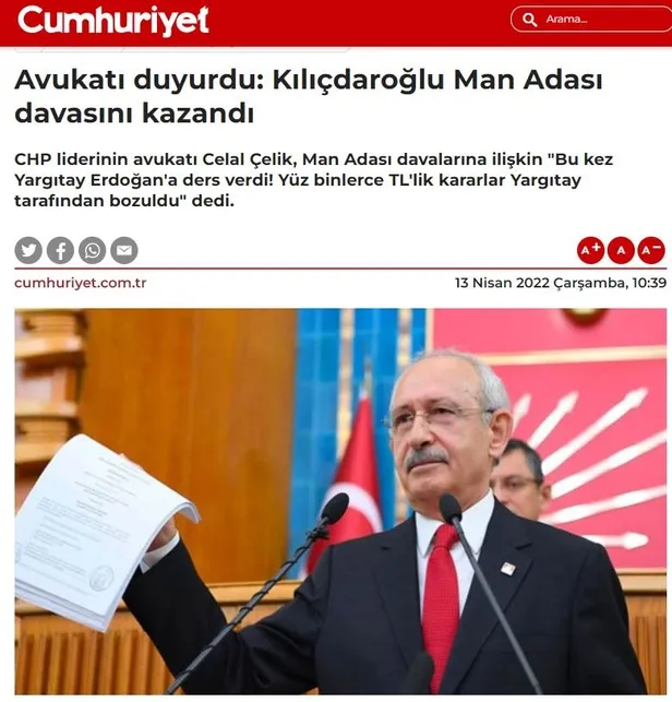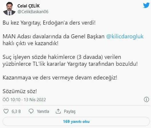 Başkan Recep Tayyip Erdoğan'ın Avukatı Doç. Dr. Hüseyin Aydın, CHP Genel Başkanı Kemal Kılıçdaroğlu aleyhine açılan manevi tazminat davalarının dört tanesinin Yargıtay tarafından onanarak kesinleştiğini açıkladı. Avukat Hüseyin Aydın yaptığı açıklamada, "Bugün itibariyle kesinleşen başka bir dosya bulunmamaktadır" ifadelerine yer verdi. Açıklamada "Man Adası iddiaları bağlamında davalı Kemal Kılıçdaroğlu'nun Sayın Cumhurbaşkanımızı hedef alan açıklamalarının da kişisel saldırı niteliğinde olduğu sonucuna varılmıştır. Yargıtay kararlarına atfen, sosyal medya mecralarında yapılan bir kısım açıklamalar, gerçeği yansıtmadığı gibi, bu nitelikteki açıklamalar ve haberler mahkeme kararlarının sorumsuzca çarpıtılmasından başka bir anlam da taşımamaktadır." ifadelerine yer verildi.